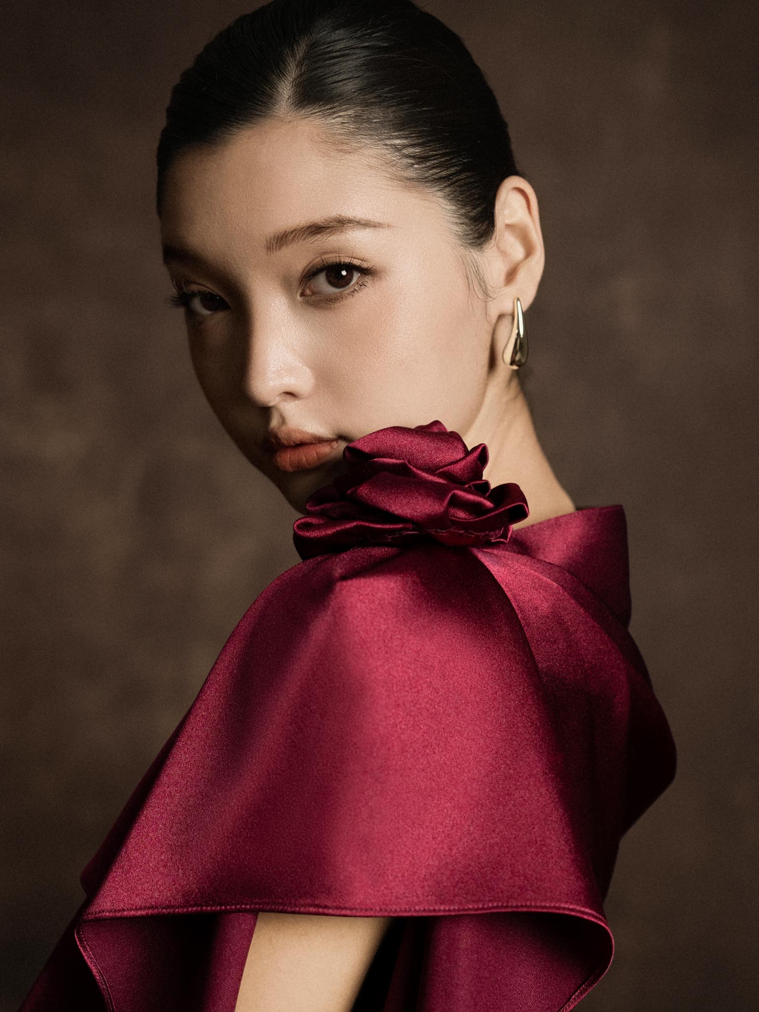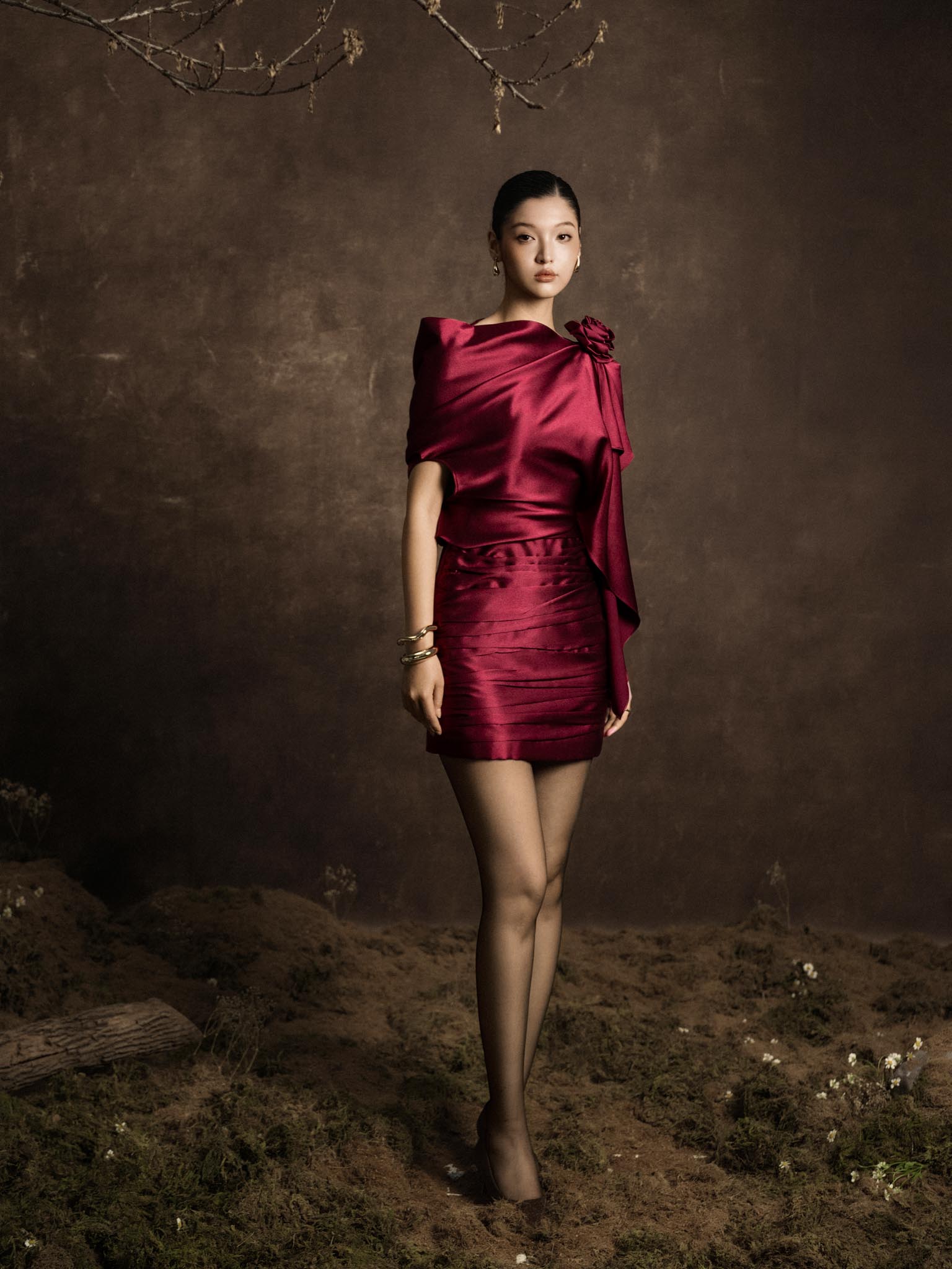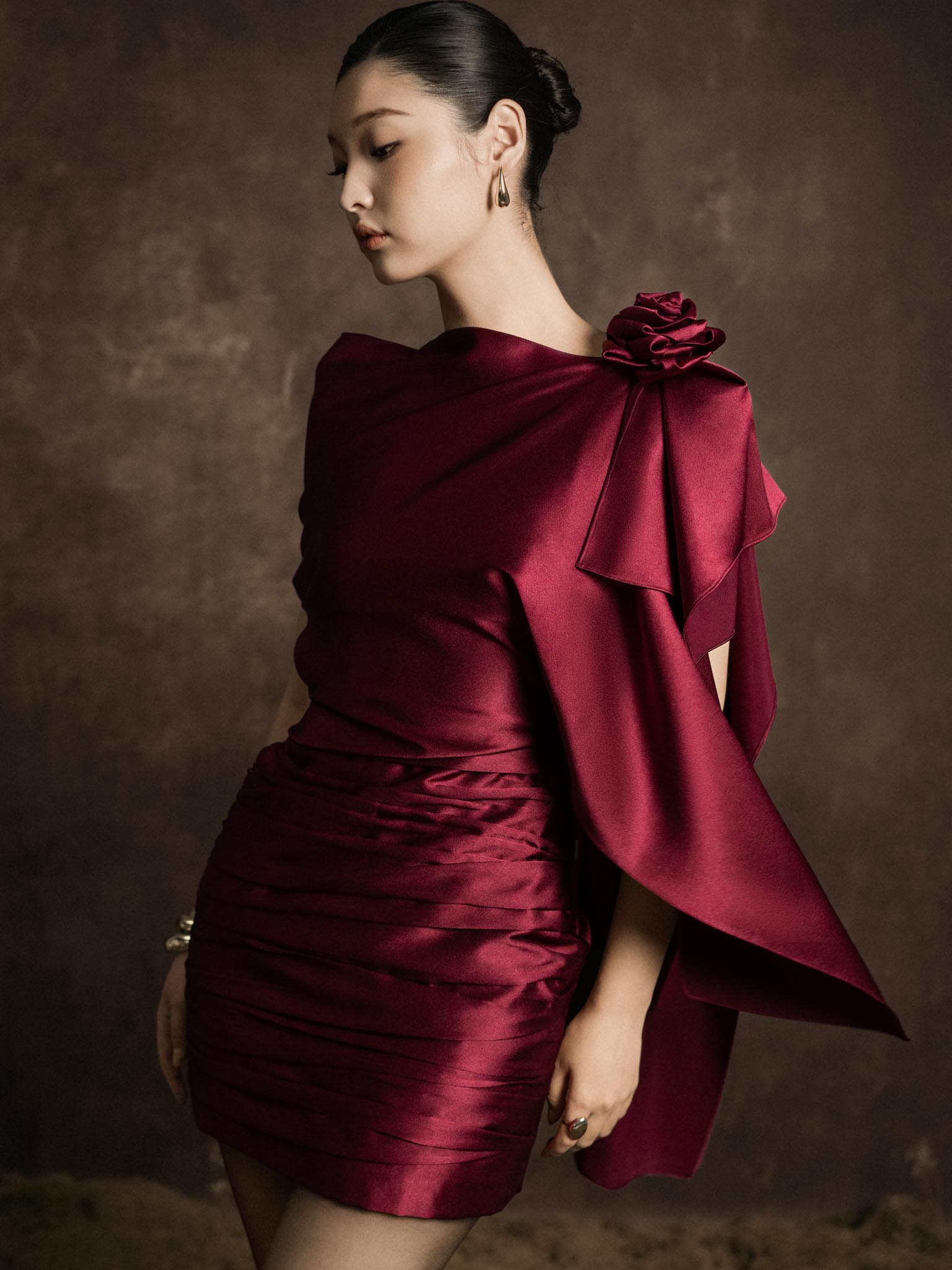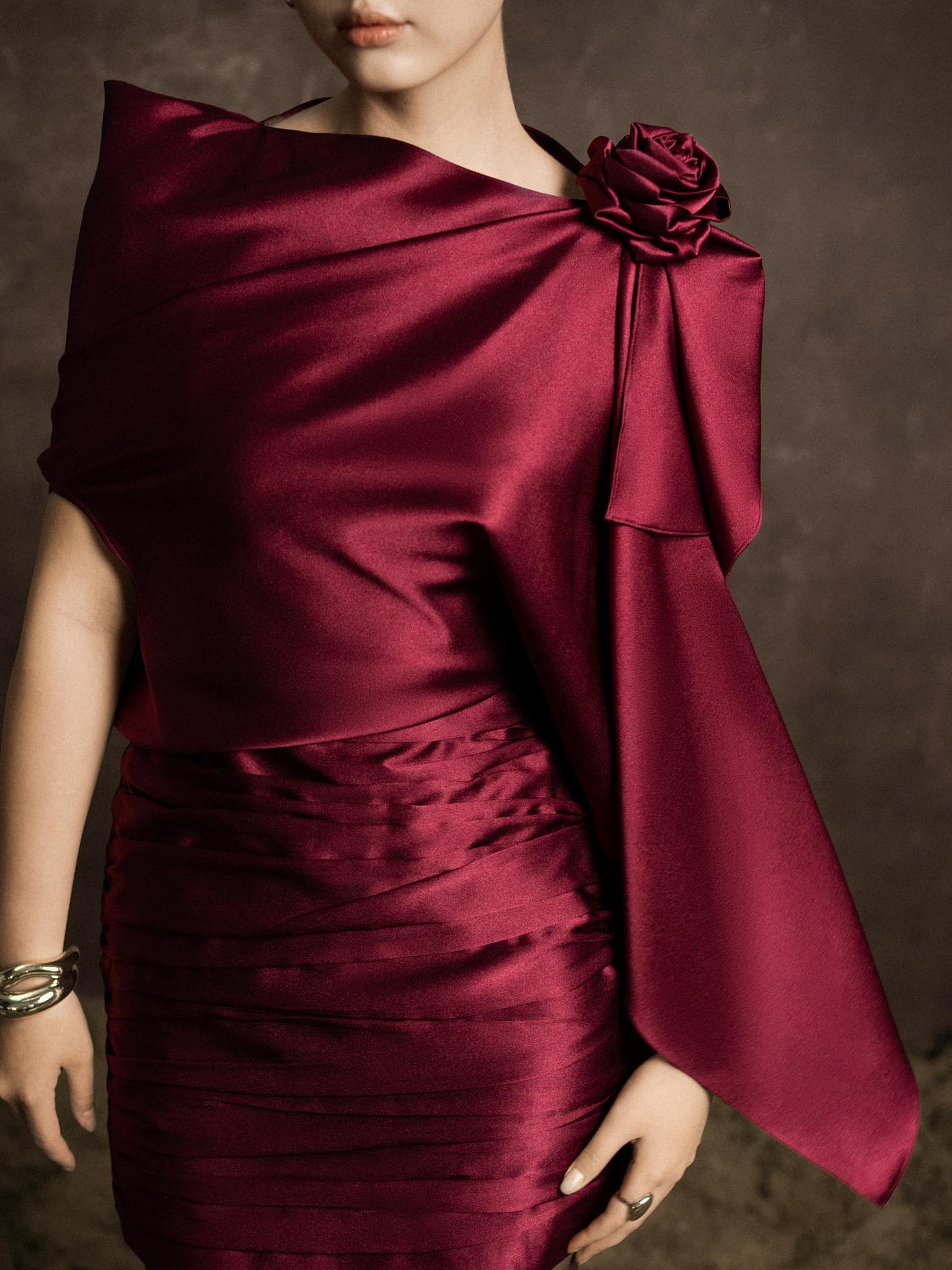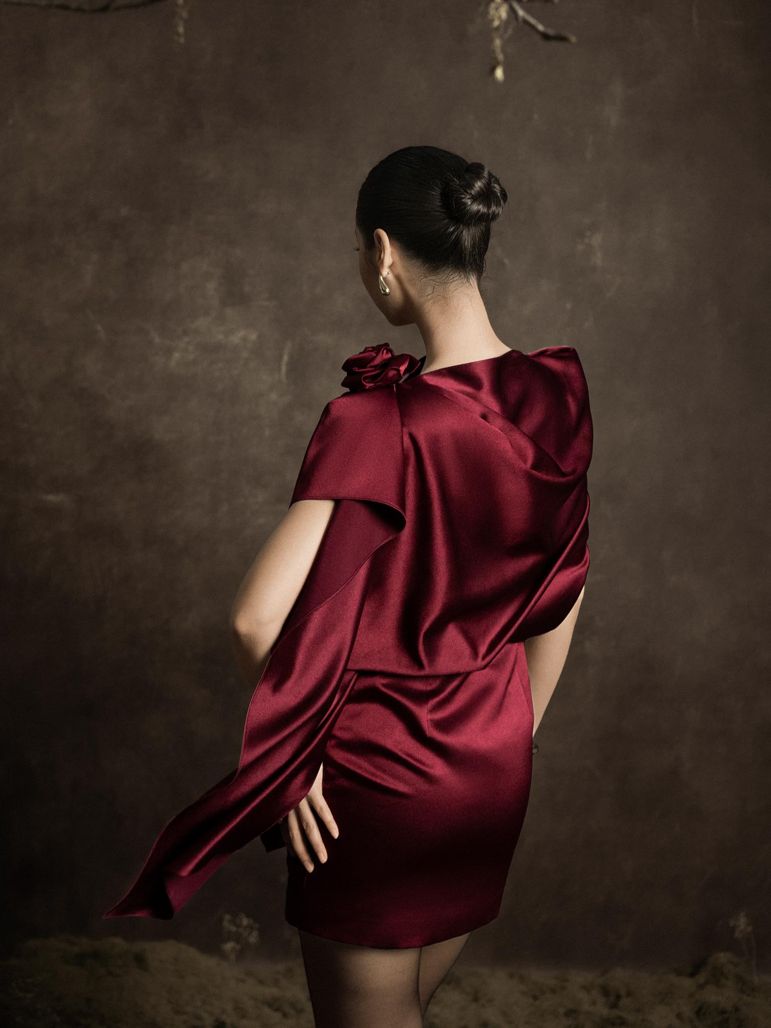 Váy lụa vạt lệch cài hoa
